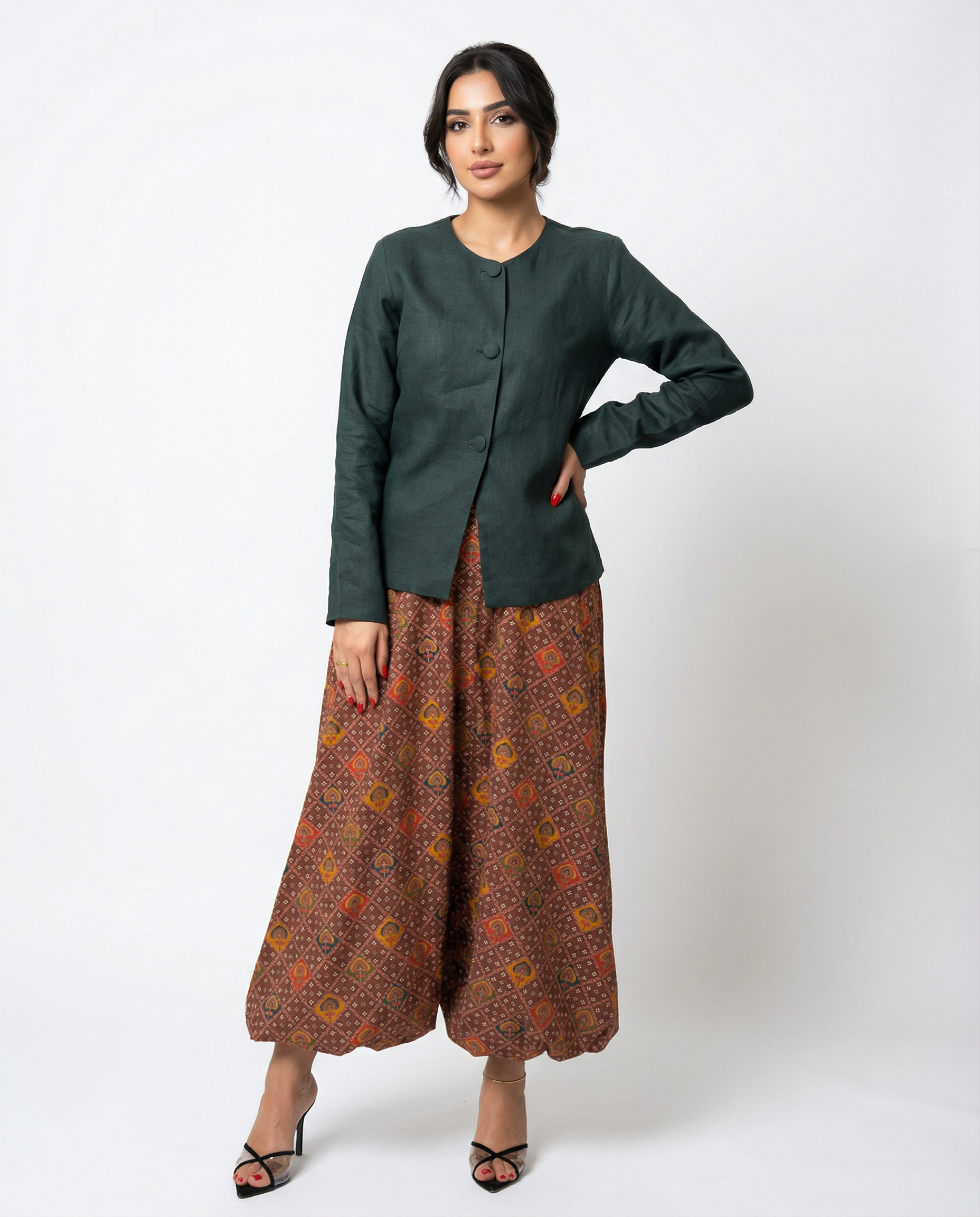جمبسوت حريمي مطبوع بلمسة عنابية: تصميم فريد ومريح من قطعة واحدة، يتميز بقصة حريمية جذابة، مزين بطبعة زهور دافئة (زيتوني ووردي). يبرز جماله عند تنسيقه مع جاكيت قصير عنابي ، مما يضفي عليه لمسة من الفخامة ويبرز جمال الألوان العميقة . هذا يجعله خيارًا مثاليًا لأمسيات رمضان الأنيقة والدافئة.
