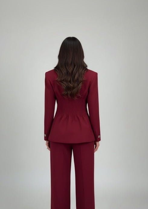 A refined and elegant suit crafted from premium Korean crepe, offering a structured yet smooth drape that enhances the silhouette beautifully. The tailored blazer defines the waist with a clean, polished finish, while the straight wide-leg trousers create a balanced and elongated look. Fully lined for added comfort and a flawless fit, this design blends sophistication, quality, and timeless appeal in one effortlessly chic ensemble.