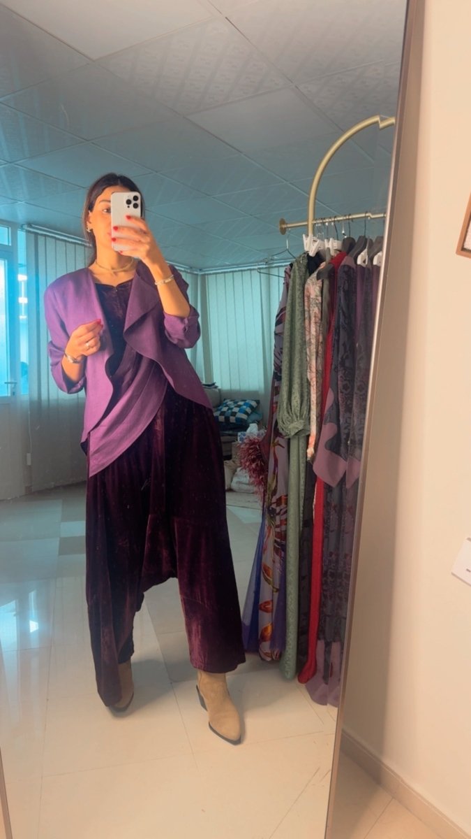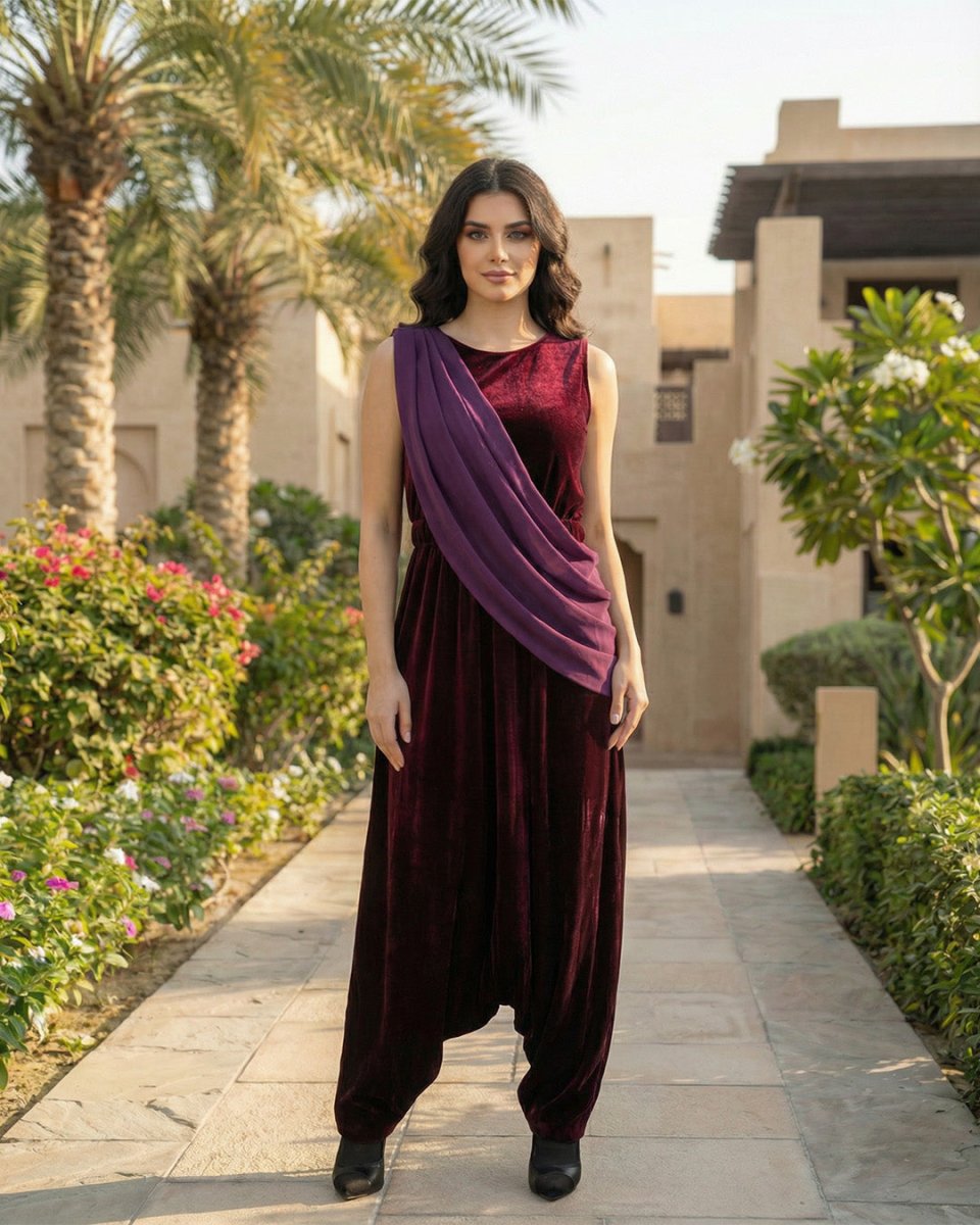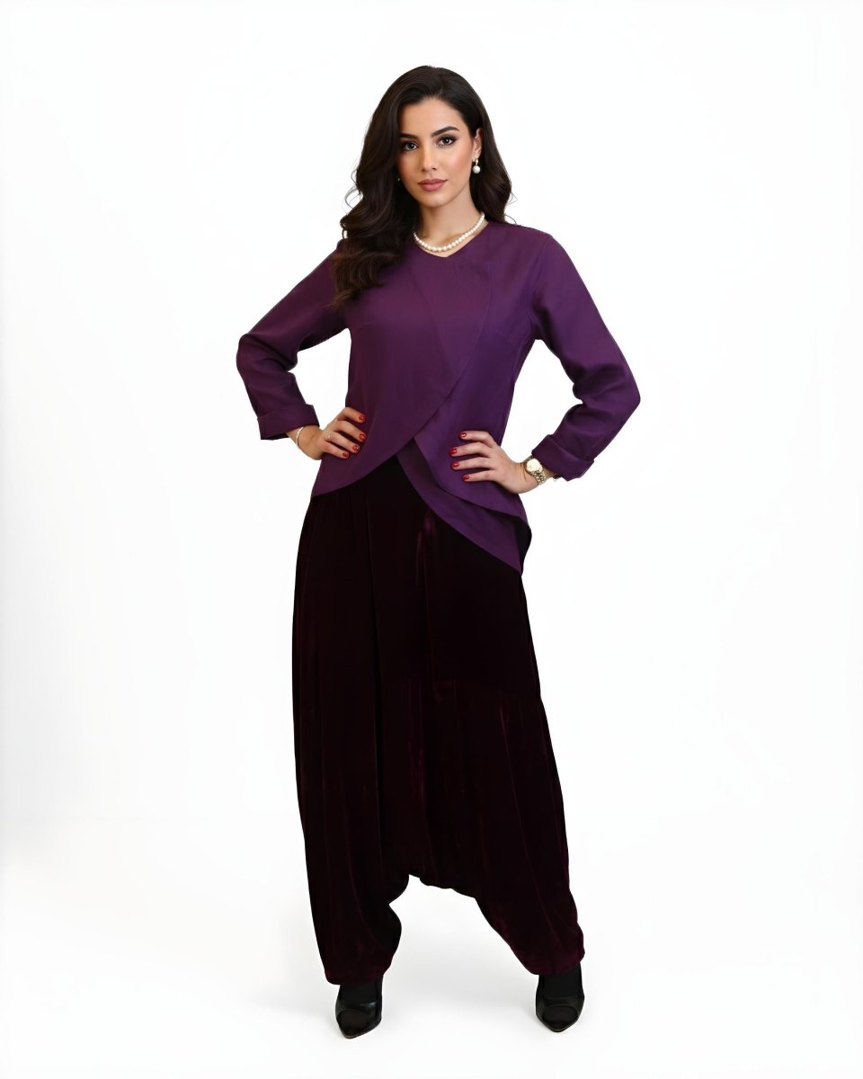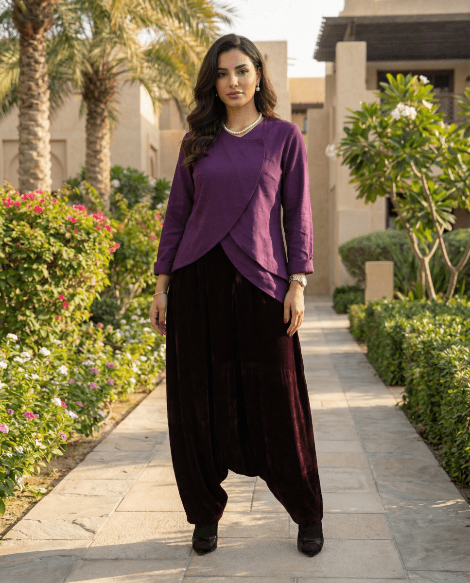 The Teal Velvet Jumpsuit: This jumpsuit beautifully marries ultimate comfort with luxurious appeal granted by the velvet fabric, making it perfect for elegant and modest evening looks during Ramadan. It is crafted from rich, velvety fabric in a sophisticated Teal/Aqua color. The silhouette is extra wide-legged or Harem-style, ensuring absolute modesty and freedom of movement. It is perfectly styled with a light gray/powder blue draped capelet or jacket, adding an elegant, flowing, and contrasting layer to complete the luxurious look.