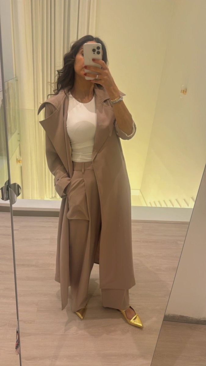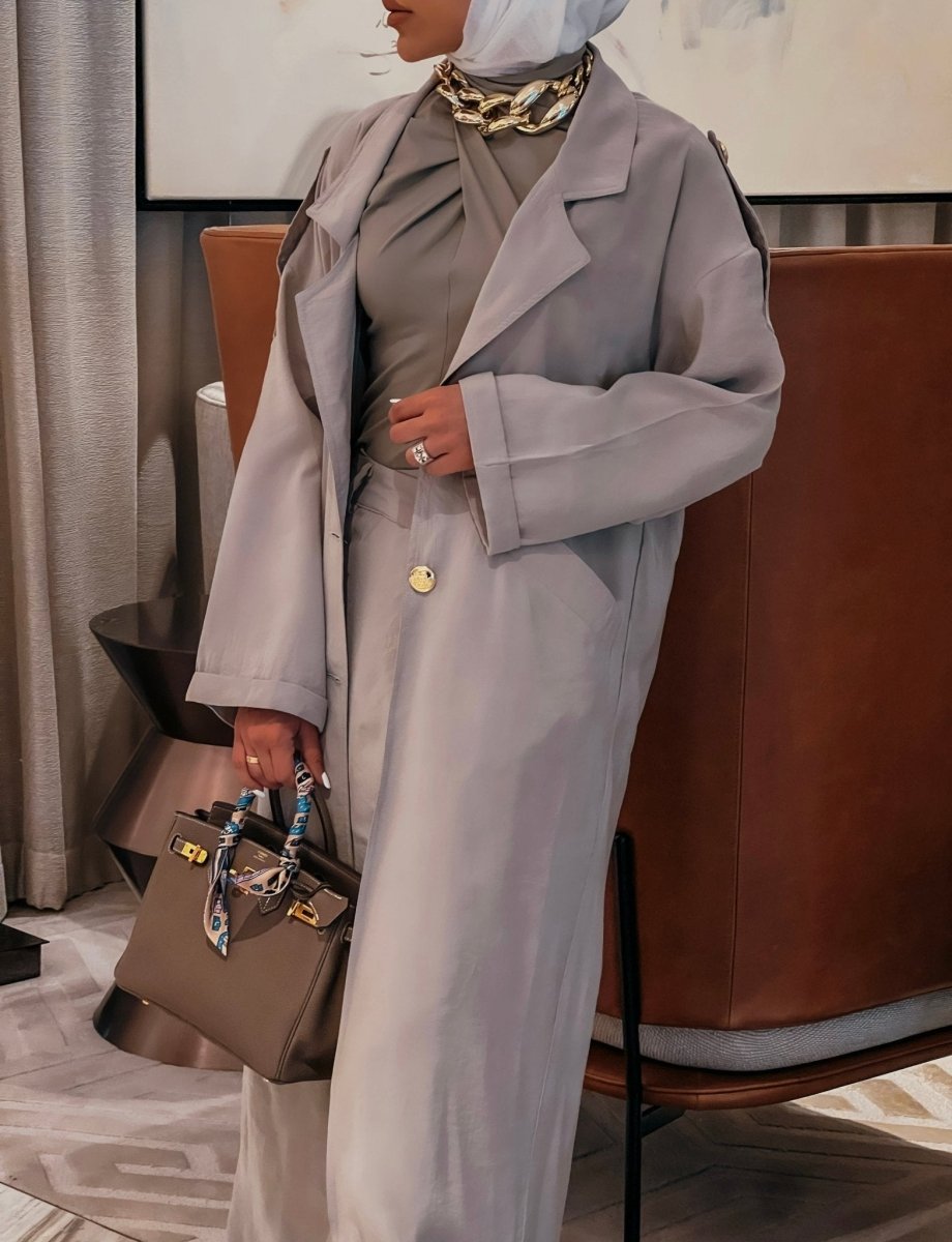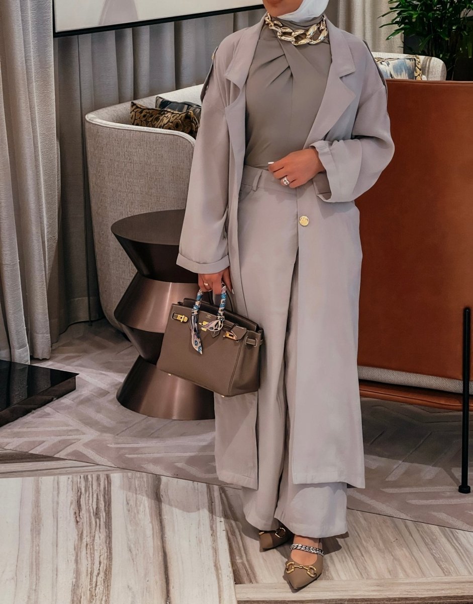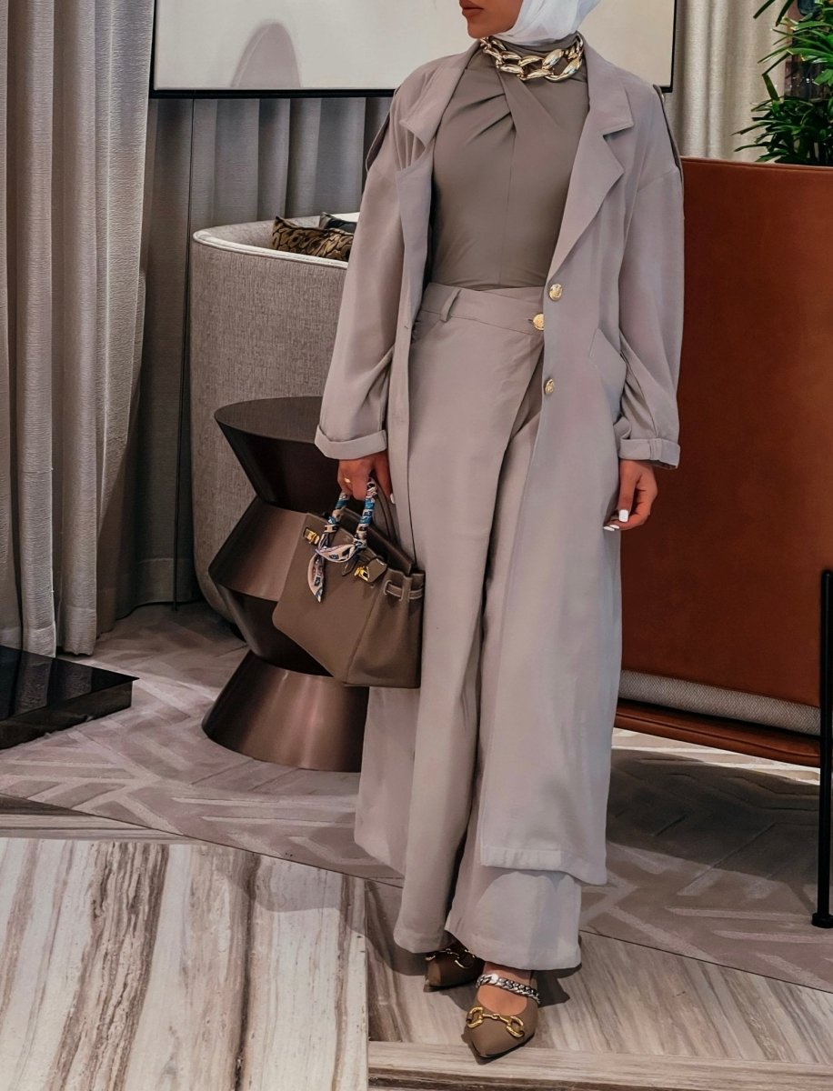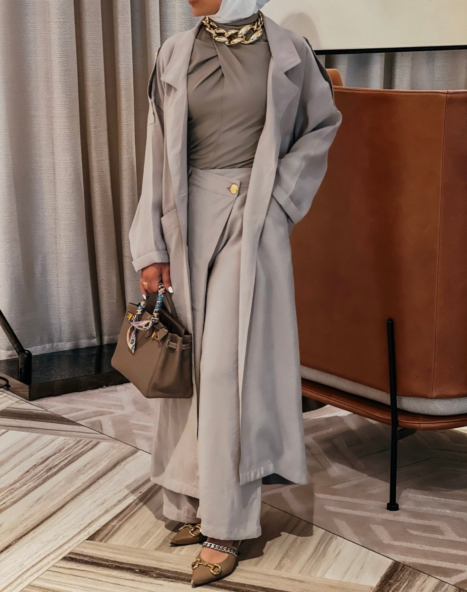 This ensemble brings comfort and practicality with a unique design. The pants feature a wrap-around skirt style, adding a touch of elegance, while the long jacket, which you can customize in length, ensures a chic look for any occasion. Made from Snow fabric—light, practical, and non-wrinkling—this set is perfect for trips, travels, or the festive Eid season. Its versatile, stylish cut makes it a standout choice for those seeking effortless elegance on the go.