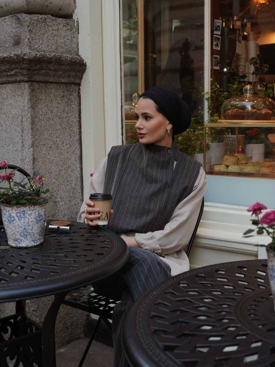 Elevate your wardrobe with this refined two-piece set crafted from premium wool blended with leather accents for a luxurious finish. The design features a modern layered silhouette with a tailored wool vest detailed in subtle pinstripes, paired with wide-leg wool trousers that offer both structure and comfort. Thoughtfully accented with smooth leather elements, this ensemble balances classic elegance with contemporary style.